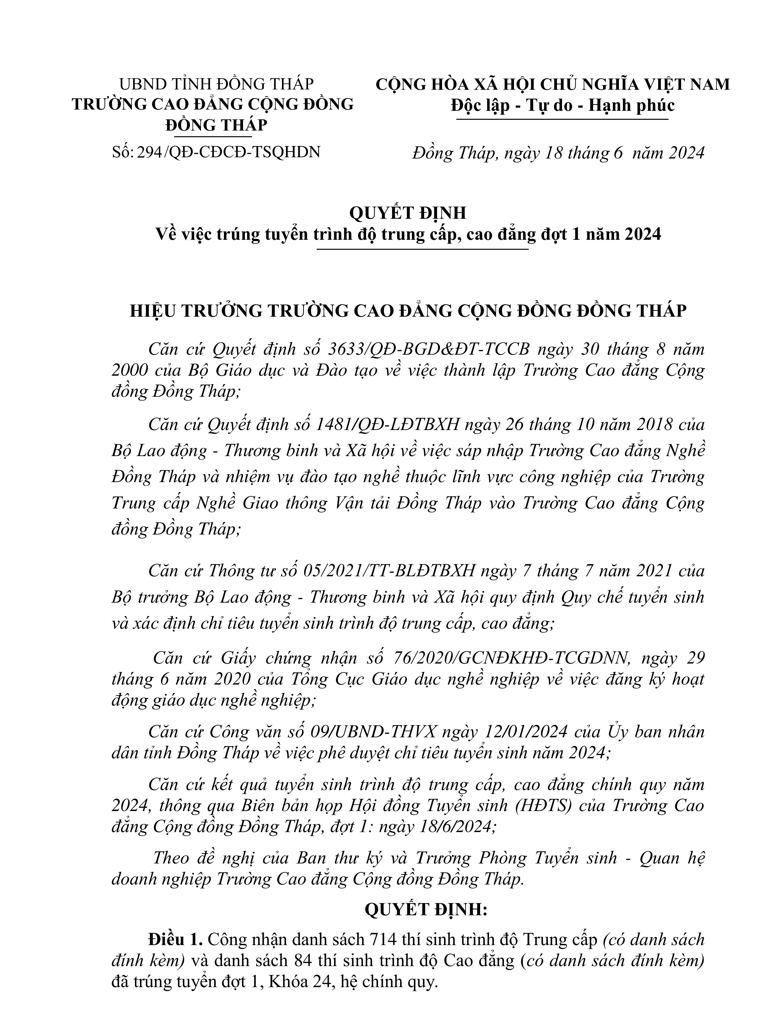 Danh sách 84 thí sinh trúng tuyển trình độ Cao đẳng 2024: Tải về