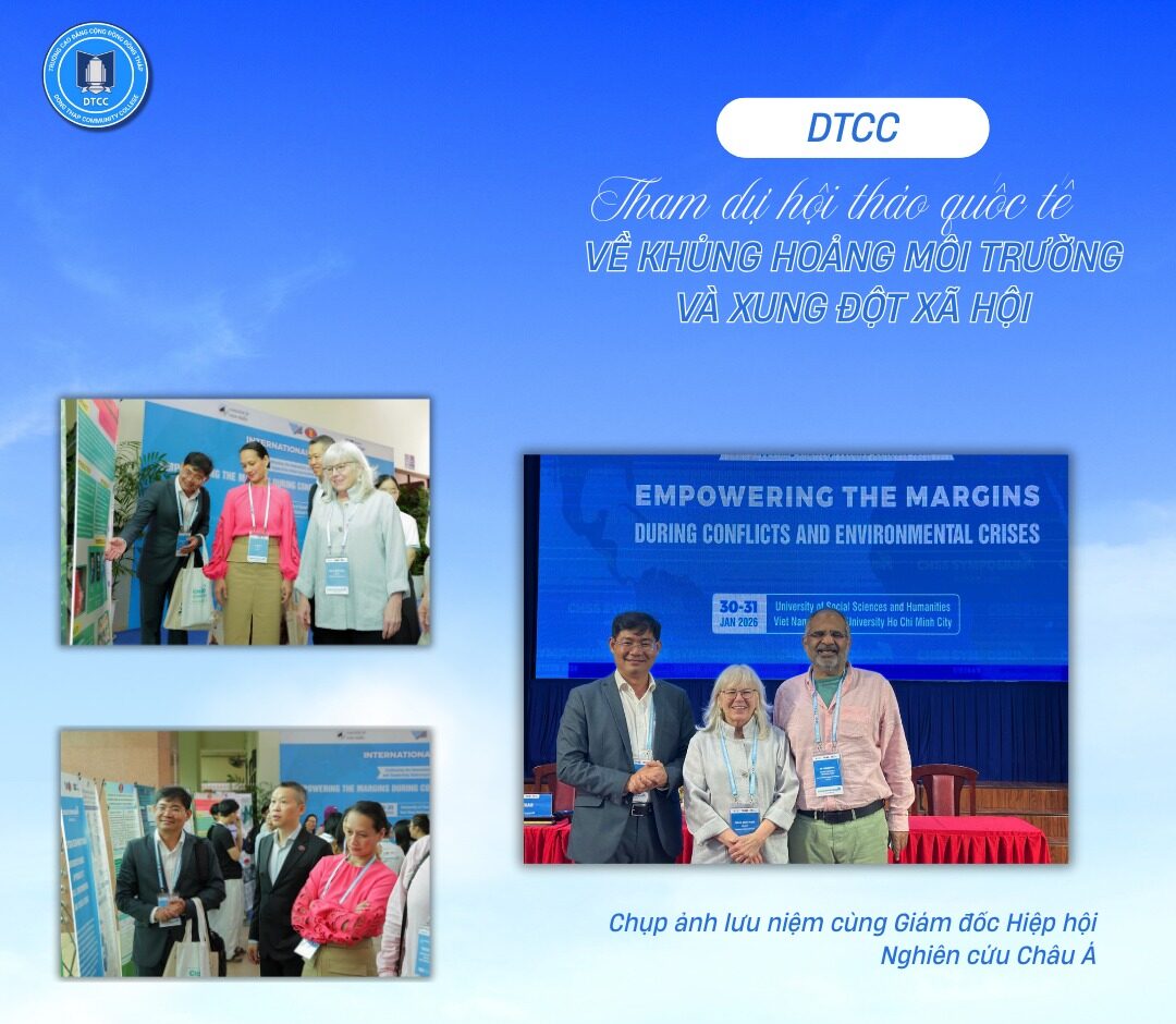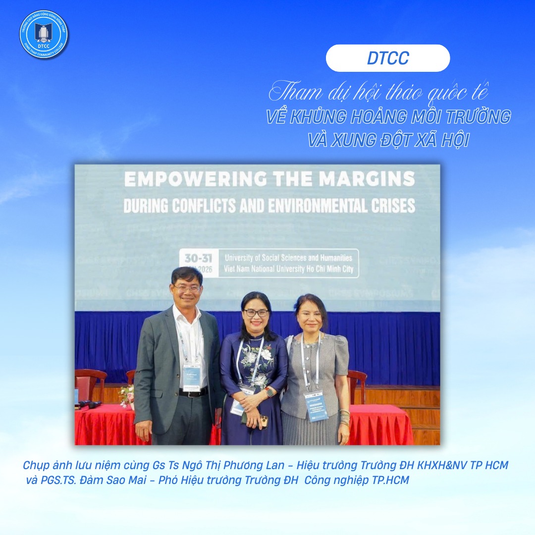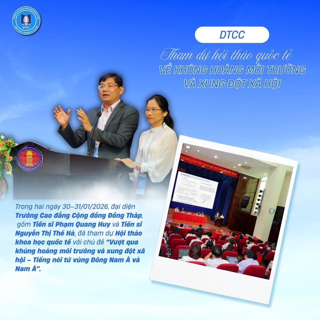 Trong hai ngày 30–31/01/2026, đại diện Trường Cao đẳng Cộng đồng Đồng Tháp, gồm Tiến sĩ Phạm Quang Huy và Tiến sĩ Nguyễn Thị Thể Hà, đã tham dự Hội thảo khoa học quốc tế với chủ đề “Vượt qua khủng hoảng môi trường và xung đột xã hội – Tiếng nói từ vùng Đông Nam Á và Nam Á”. Hội thảo được tổ chức tại Trường Đại học Khoa học Xã hội và Nhân văn, Đại học Quốc gia Thành phố Hồ Chí Minh (USSH–ĐHQG-HCM).