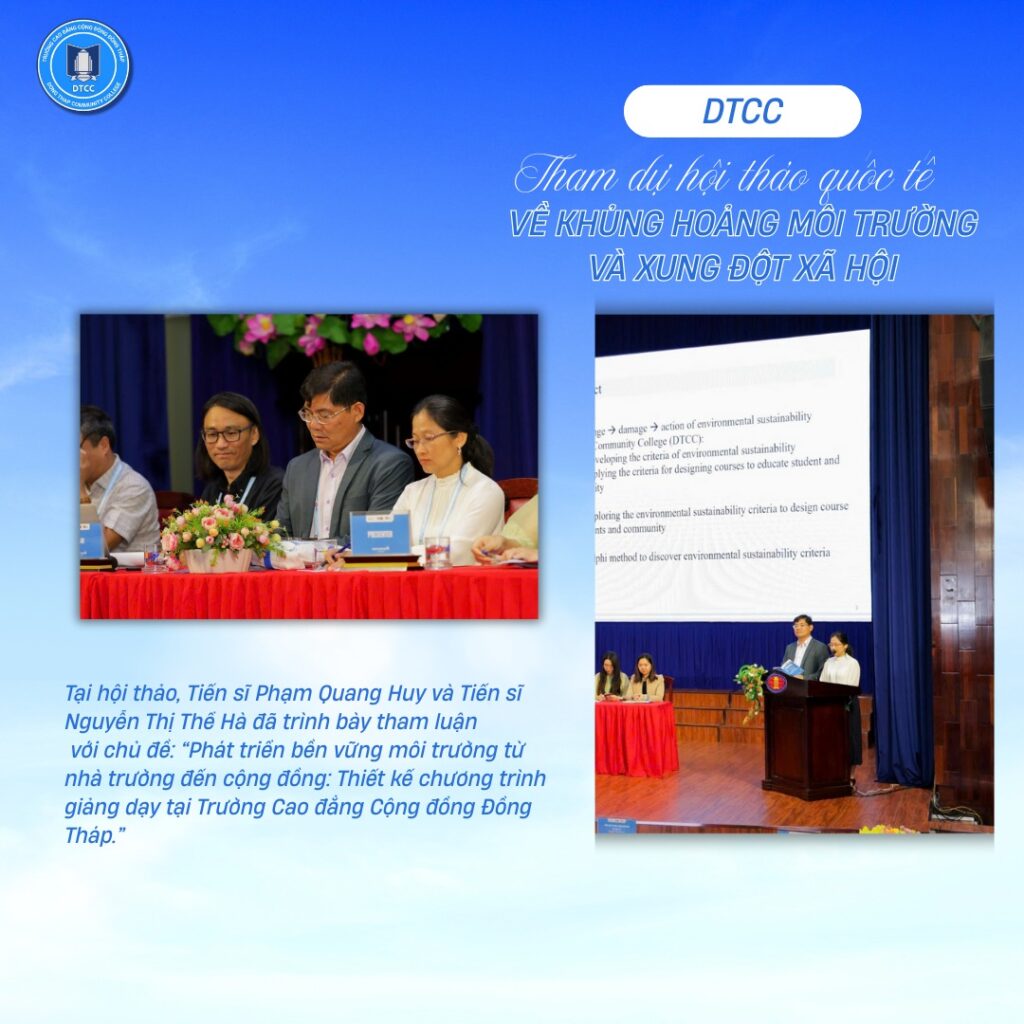 Tại hội thảo, Tiến sĩ Phạm Quang Huy và Tiến sĩ Nguyễn Thị Thể Hà đã trình bày tham luận với chủ đề: “Phát triển bền vững môi trường từ nhà trường đến cộng đồng: Thiết kế chương trình giảng dạy tại Trường Cao đẳng Cộng đồng Đồng Tháp”. Tham luận tập trung phân tích vai trò của giáo dục cộng đồng trong nâng cao nhận thức môi trường, đồng thời giới thiệu mô hình thiết kế chương trình giảng dạy gắn kết giữa nhà trường và cộng đồng địa phương, hướng tới mục tiêu phát triển bền vững và thích ứng với các thách thức môi trường hiện nay.