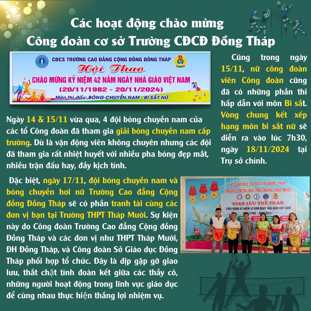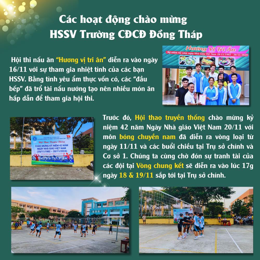 Nhiều hoạt động sôi nổi chào mừng kỷ niệm 42 năm Ngày Nhà Giáo Việt Nam (20/11/1982 – 20/11/2024) tại Trường Cao đẳng Cộng đồng Đồng Tháp. Trong những ngày tháng 11 ý nghĩa, Trường Cao đẳng Cộng đồng Đồng Tháp đã có nhiều hoạt động sôi nổi với sự tham gia, hưởng ứng của các cán bộ, giảng viên và HSSV để chào mừng Ngày Nhà giáo Việt Nam 20/11.