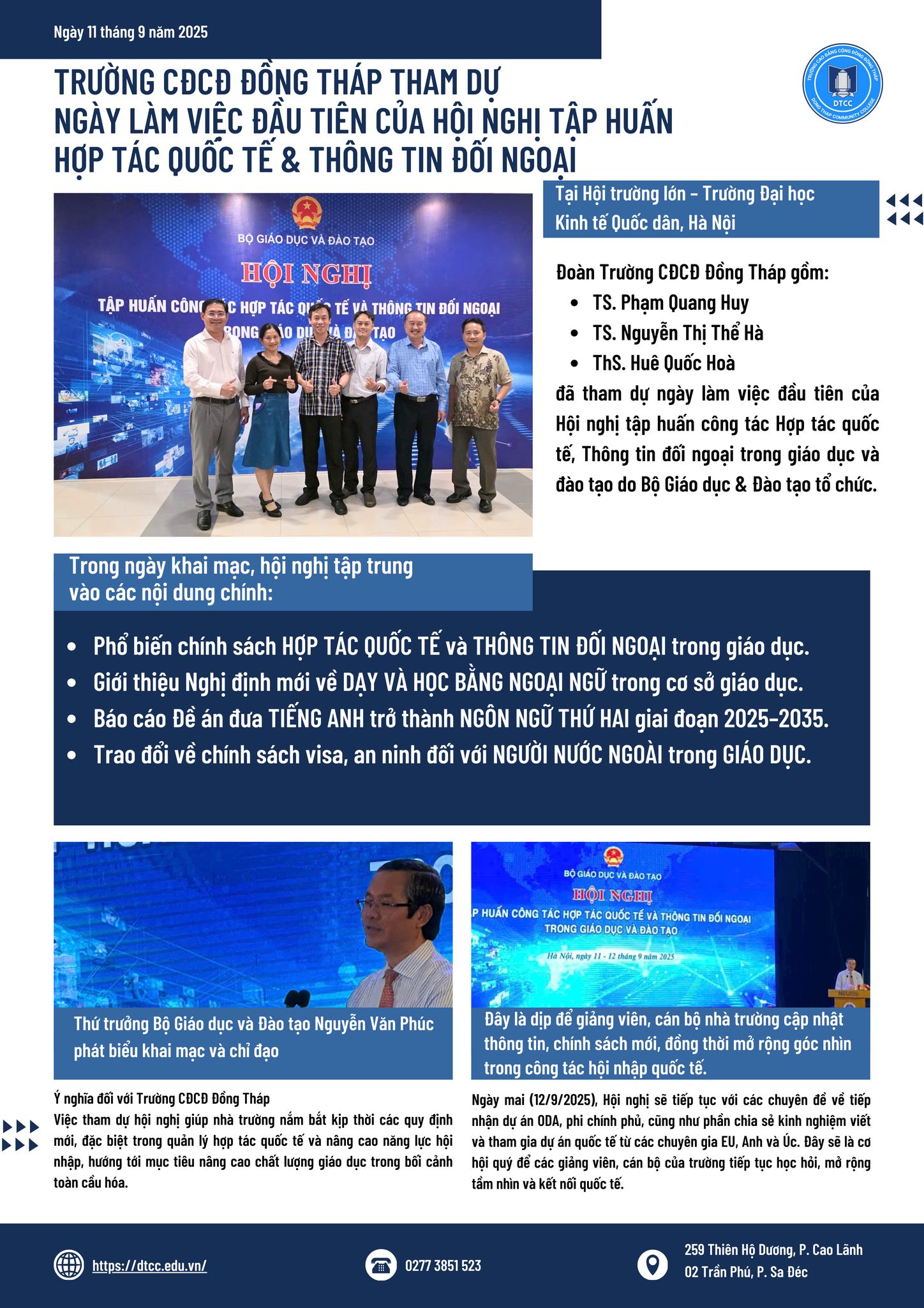 Trường CĐCĐ Đồng Tháp tham dự Ngày làm việc đầu tiên của Hội nghị Tập huấn Hợp tác quốc tế & Thông tin đối ngoại Posted on 12/09/2025 by Minh Nguyễn Lượt xem: 870 Xem thêm: Vững bước phát triển trong giai đoạn mới Hướng dẫn ký số văn bản bằng VNPT SmartCA trên máy tính và điện thoại Thông tư quy định Quy tắc ứng xử của nhà giáo Trung cấp Công nghệ kỹ thuật điều khiển tự động Ký kết thỏa thuận hợp tác với Công ty Cổ phần GTA EDUTECH Việt Nam Bài viết cùng chủ đề: Hợp tác quốc tế – lan tỏa giá trị nông nghiệp hưu cơ [Video] DTCC cơ hội việc làm cho sinh viên từ thúc đẩy hợp tác quốc tế Mở rộng hợp tác quốc tế – kết nối cơ hội học tập tại Hàn Quốc Trường Cao đẳng Cộng đồng Đồng Tháp tổ chức buổi gặp gỡ, chúc Tết các lưu học sinh đang học tập tại trường Trường Cao đẳng Cộng đồng Đồng Tháp tiếp, làm việc cùng Công ty Cổ phần Quốc tế Tập đoàn Hàn – Việt KVN Trường Cao đẳng Cộng đồng Đồng Tháp tiếp và làm việc với đoàn công tác UNIDO [Video] Sinh viên DTCC hội nhập quốc tế – hành trình bắt đầu từ những bước đi hôm nay. Từ nông sản đến hàng hóa – tri thức tạo giá trị mới! Dự hội thảo khoa học quốc tế về khủng hoảng môi trường và xung đột xã hội Từ nông sản địa phương đến sản phẩm chất lượng cao – hành trình học hỏi cùng chuyên gia Nhật Bản Tiếp Đoàn công tác Tổ chức Lương thực & Nông nghiệp Liên Hợp Quốc (FAO) và Viện Mekong – Đại học Cần Thơ Tổ chức ASSIST Inc bàn giao tài trợ thiết bị thực hành điện, điện tử Tăng cường hợp tác quốc tế – mở rộng cơ hội việc làm cho sinh viên Trường Cao đẳng Cộng đồng Đồng Tháp Hội thảo quốc tế về Chuyển đổi số giáo dục nghề nghiệp tại Bắc Kinh (Trung Quốc) Hội thảo quốc tế “Nữ lãnh đạo: Sức mạnh từ bản thân” Tổng Lãnh sự quán Nhật Bản tại TP Hồ Chí Minh thăm, làm việc với Trường Cao đẳng Cộng đồng Đồng Tháp Trường Cao đẳng Cộng đồng Đồng Tháp triển khai đánh giá ngoài chương trình đào tạo Thông báo chiêu sinh lớp Tiếng Nhật cơ bản dành riêng cho học sinh – sinh viên
